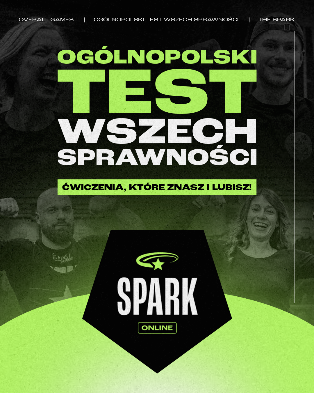 The Spark to ogólnopolski test wszechsprawności rozgrywany online w aplikacji Overall Games. 5 wyzwań, które znasz i lubisz, sprawdzających siłę, szybkość, moc i wytrzymałość. Startujesz gdzie chcesz i kiedy chcesz, a Twój wynik trafia do ogólnopolskiego rankingu. Dla każdego poziomu – liczy się wszechsprawność, nie jedna cecha.